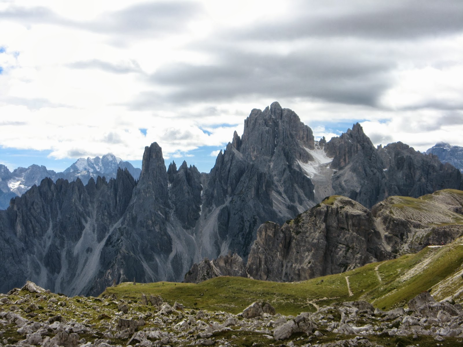 Piero drove quite a distance up Le Tre Cimine and parked and, stick in hand (even Jim had a stick because Piero insisted on him using his mushroom locating one!) we made our way to the refuge - that is what they call a cafe/restaurant/B&B on a mountain. Piero and Jim hiked along to a farther refuge and Gloria and I took refuge in the refuge beside a window from which we could view the dramatic scenery (reminiscent of the Rockies). Jim was really appreciative of not having to negotiate the twists and turns of the mountain as Piero was chauffeur but I noticed that, in fact, he seemed to think he was driving and had his eyes fixed forward as if he had to concentrate fully on keeping to the road rather than enjoying what was to be seen on left and on right and in all directions!