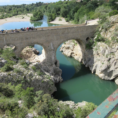 In one of the more friendly tourist offices it was recommended to us to do a trip in the Herault region of Languedoc and to visit Saint Guilhem du Desert. So we did. I even managed to get Nunu to plot an itinerary that did not involve the auto route. It was a really pleasant journey and just before we arrived at St. Guilhem we came upon Le pont du Diable (the Devil’s Bridge) a bridge over les Gorges de l’Herault. Those of you who know us will remember that we think gorges are gorgeous and we have been to many.This bridge is one of France’s oldest bridges.